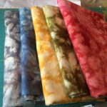 A few miscellaneous projects…I’m not sure where the inspiration came from, but I had a lot of fun making wool felt look like birch bark! (See the photo on left below). With some very heavy fusible interfacing, two colors of wool felt, two colors of thread, some wool roving, and a few hours on the sewing machine, I created these wall pockets as gifts for my brothers as well as my children. This photo is of one of the ‘early’ ones – in later ones, I used raffia for sewing the edges, deer antler for the buttons (yes, my DH cut up a deer antler I had picked up at a shop in the Black Hills!), and some ultra suede for the trim. From across the room, people didn’t realize they weren’t the real thing! Pure fun! I have an idea for a birch wall hanging…!! The middle photo shows a top that I appliqued/pieced and am currently hand quilting. The photo colors are a bit off, but it is a colorful rendition of a Laundry Basket quilt pattern – Prairie Peony. Since I’ve spent the last couple of years focusing on wool/wool felt, I am determined to have a ‘regular’ quilt to enter in a few shows this fall, especially since our quilt group is going to sponsor a show later this fall. The last photo on the right, was my latest find; I was actually looking for pastel wool yardage and was disappointed not to find any. BUT, this is what I ran across! I’ve learned that if you find wool you like, get it while you can, because it may not be there in the future! So now I will have wait till the next month to go after the pastels I was looking for originally!! Budgets! Can’t live with ’em, can’t live without ’em!