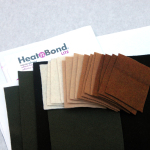 This is a felted woven wool kit featuring very dark green and black backgrounds topped with 16 modern leaves – 4 each of 4 colors ranging from off white to light rust brown – all appliqued on a 14″ square. The kit contains everything needed to complete the Modern Leaves pattern [T14-016].