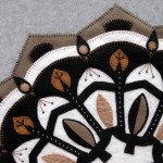 In a desire to create a more contemporary design, this 22-23” topper is inspired by the beautiful stained glass rose windows often seen in cathedrals. It uses a variety of threads and beads for embellishment and surface embroidery. This pattern is suitable for an advanced beginner – it is not particularly difficult, but does call for some patience and diligence in applying the large rose window appliqué.